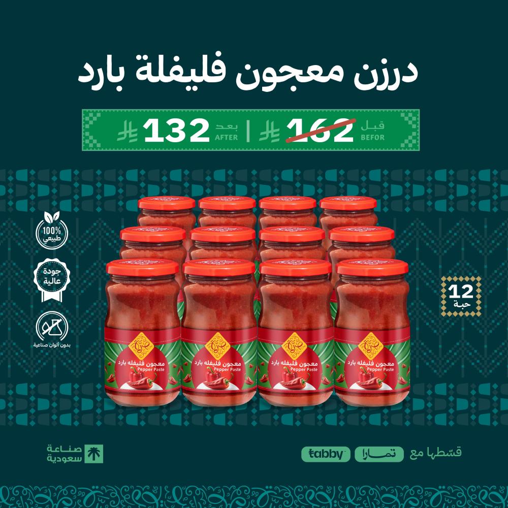 حضرنا لك معجون مميز خالي من الإضافات الصناعية من أجود أنواع الفلفل البارد الطازج المجفف بعناية والمحضر بتقنيات عالية للمحافظة على جودته وطعمه ،لتحظى بمعجون فاخر صحي يمكنك اضافته لكافة طبخاتك المنوعة وأطباقك اللذيذة وبأحجام متعددة تناسب احتياجك.